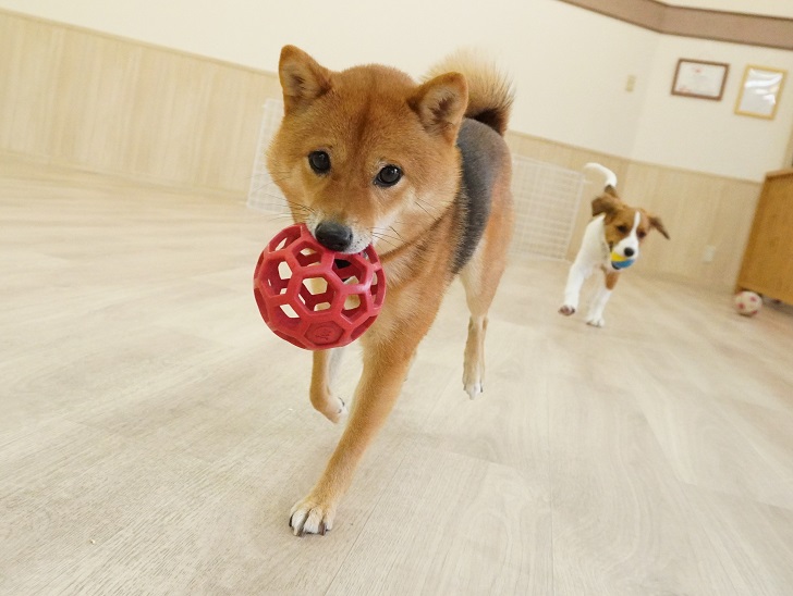 モコちゃんはハンナちゃんごとおもちゃを引っ張り始め、ハンナちゃんはおもちゃと一緒に引っ張られても離すことはなく、引き分けに終わったのでした(^^)