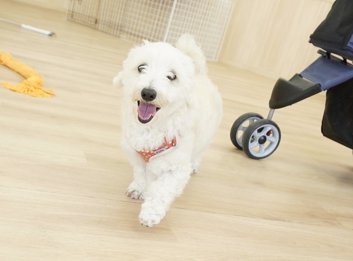 すると、きなこちゃんはスタッフの誘導がなくても、ピョーン♪とペットカートに乗れるようになりました☆