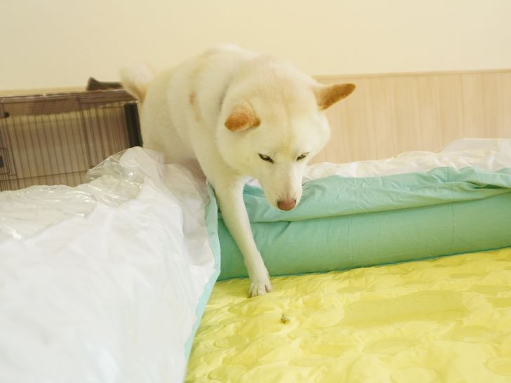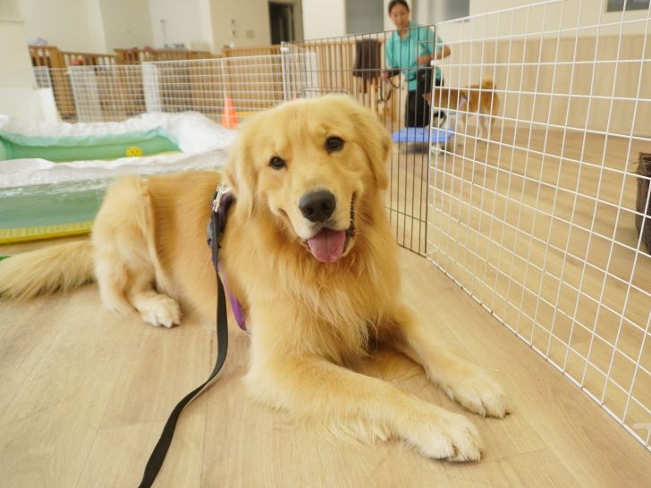 スタッフがプールを持ってくると、「ここに乗ったらいいんだよね?」と伏せでスタンバイ(*’▽’)