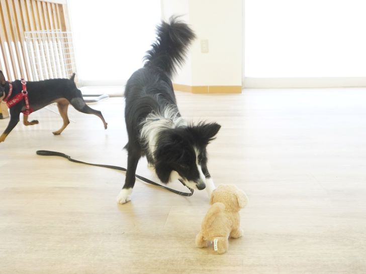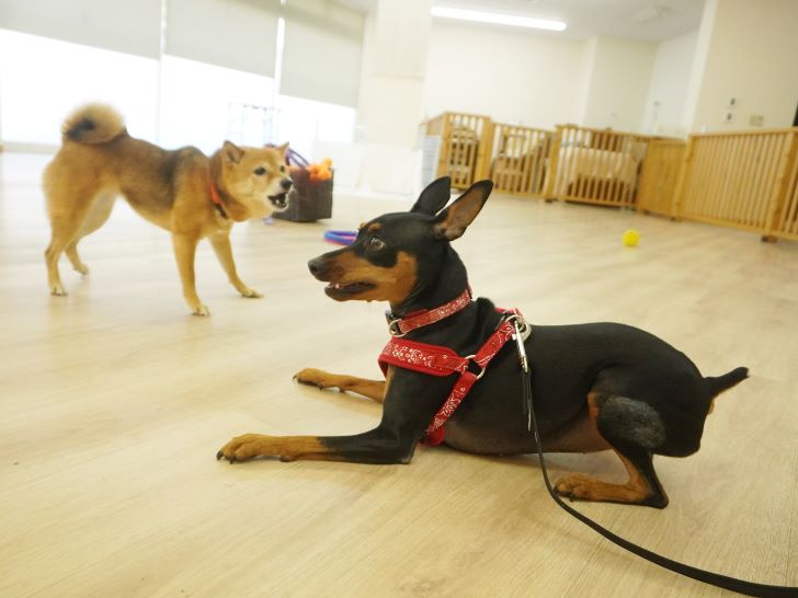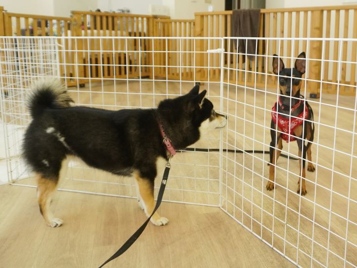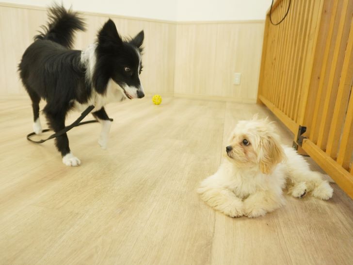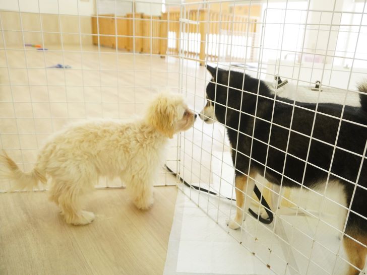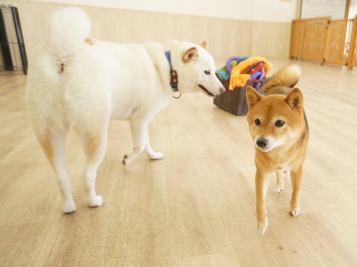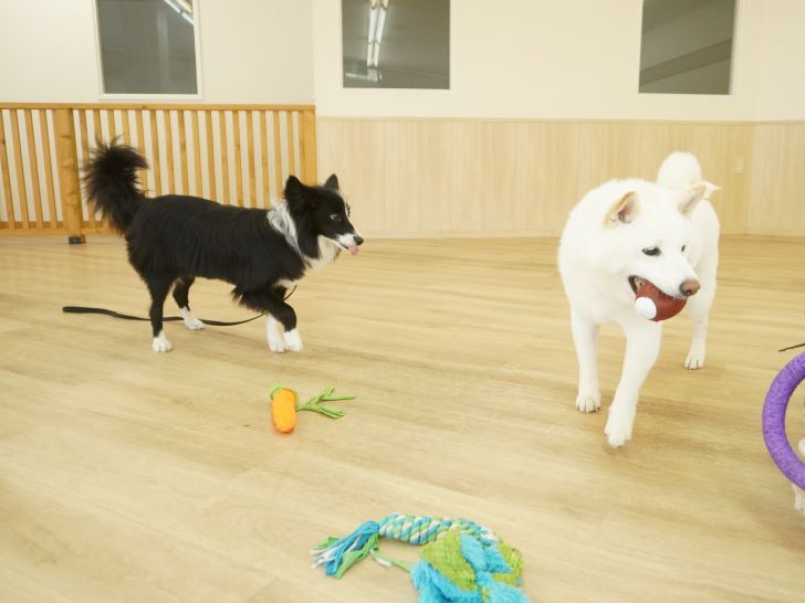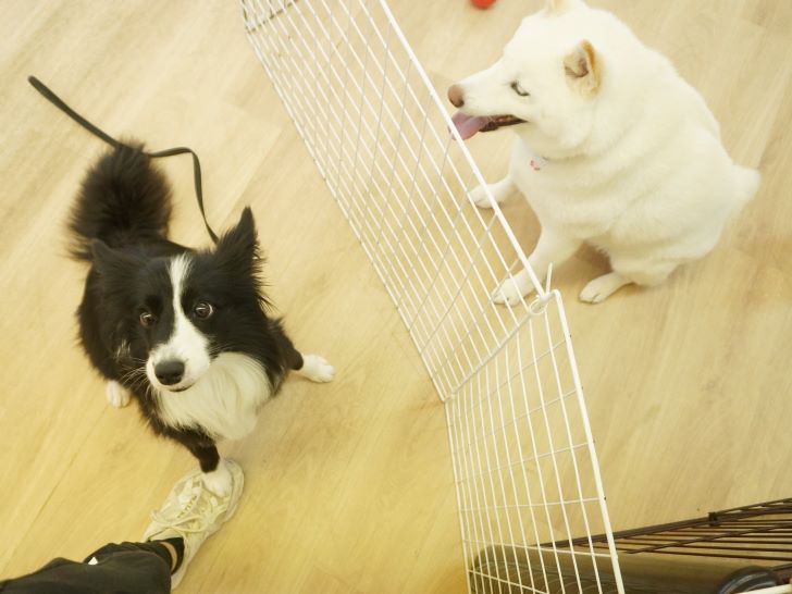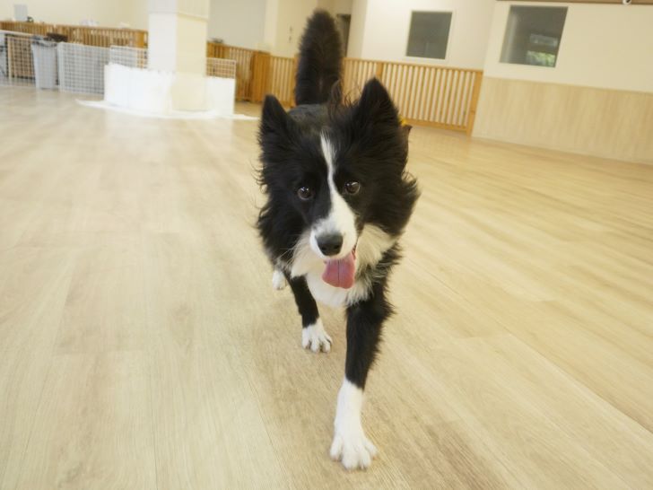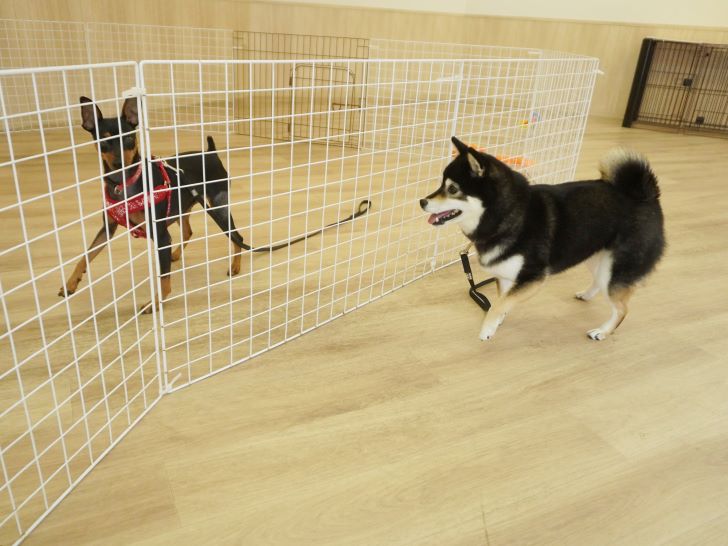 ケリーちゃんの穏やかなご挨拶に安心した大五郎君は、尻尾を上げてフリースペースを探索するようになりました♪