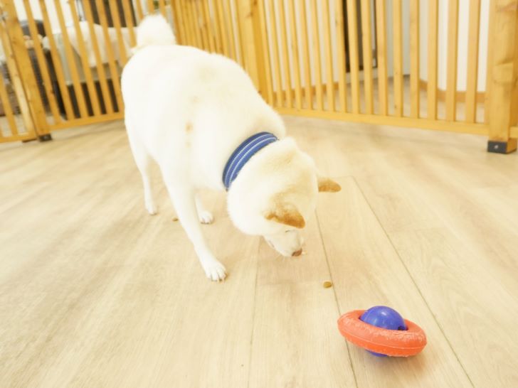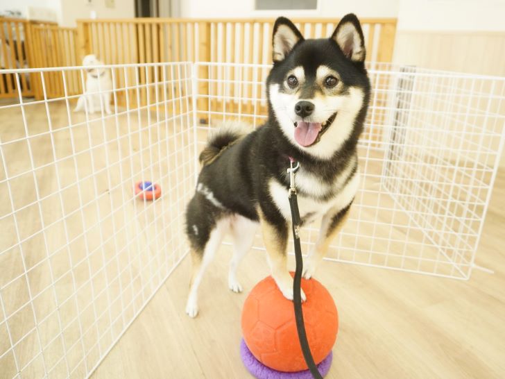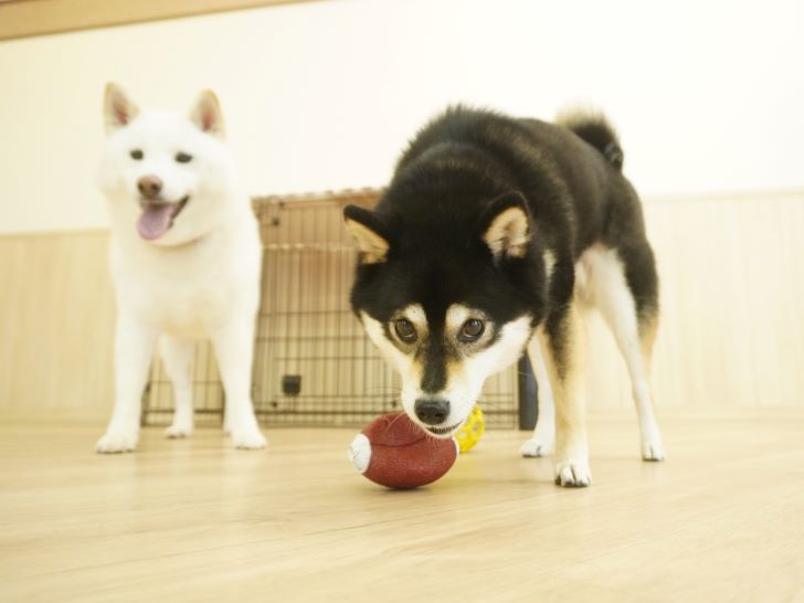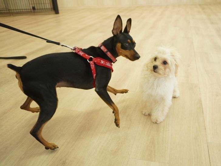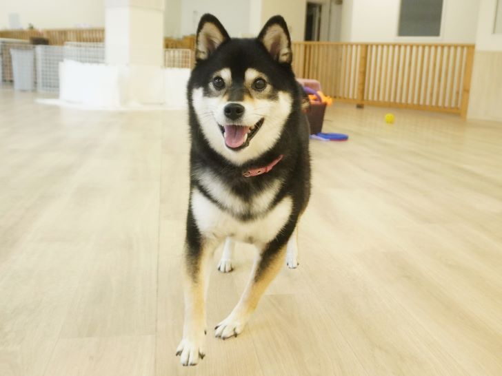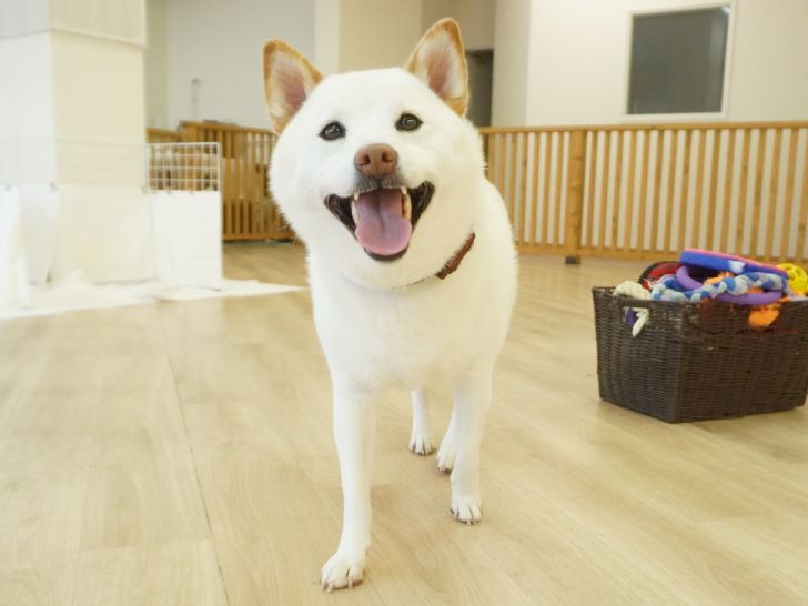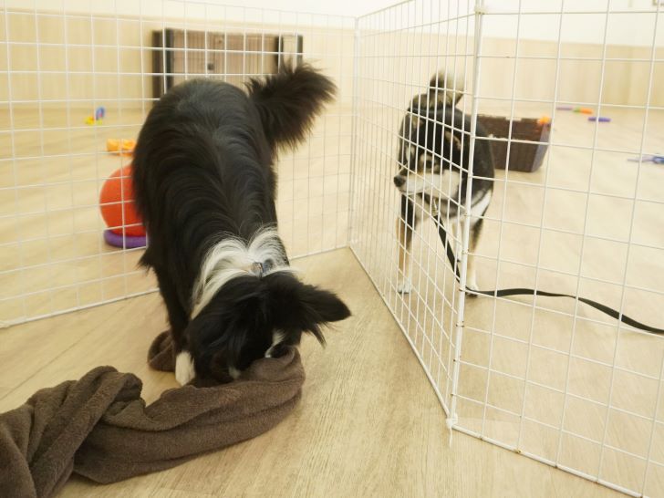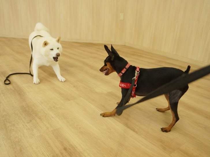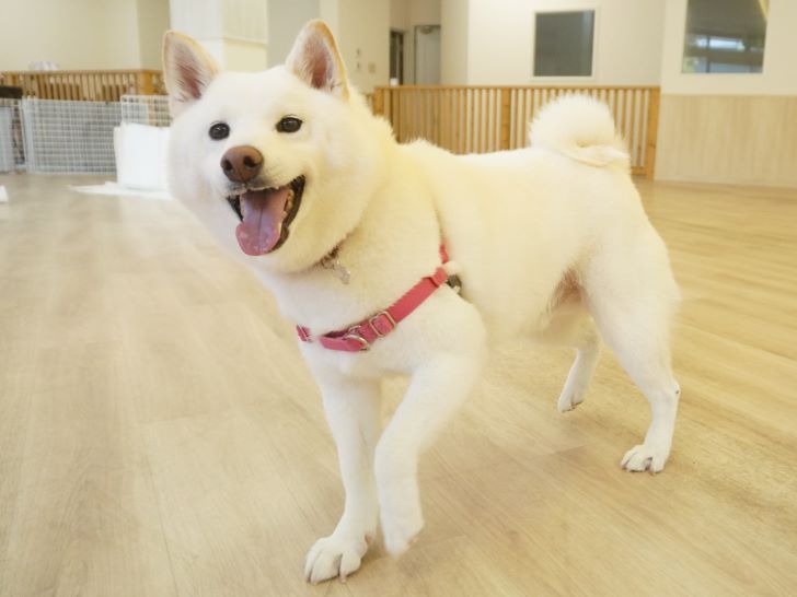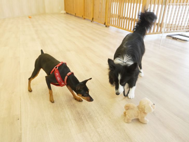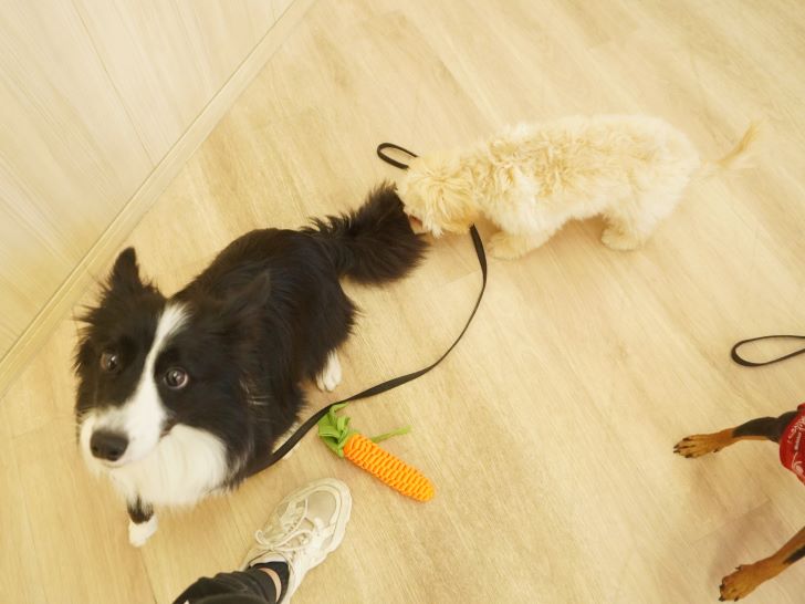 ケリーちゃんの穏やかなご挨拶に安心した大五郎君は、尻尾を上げてフリースペースを探索するようになりました♪