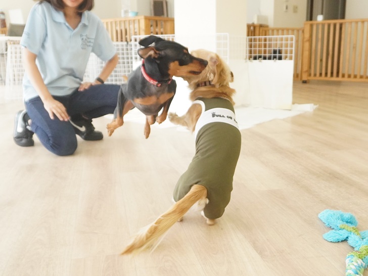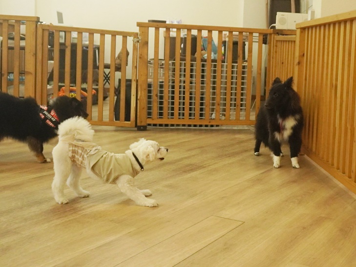 そのテンションのままベルちゃんの元へダッシュで近づき、おしゃべりしながらプレイバウポーズで「ねえ!遊ぼうよ!!」と全力でお誘いしていましたよ♪