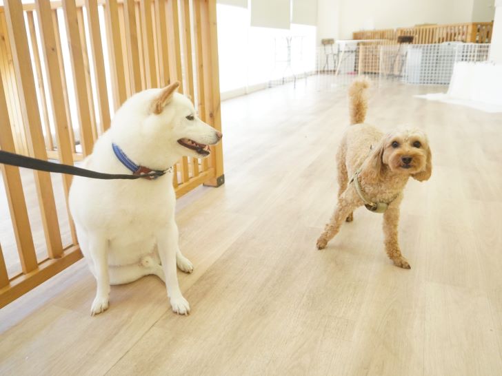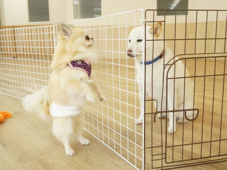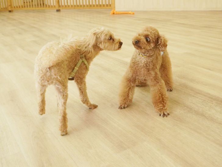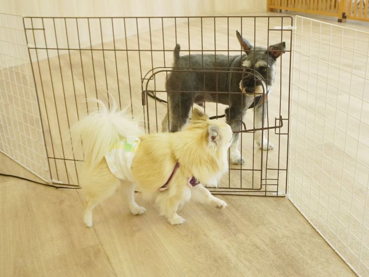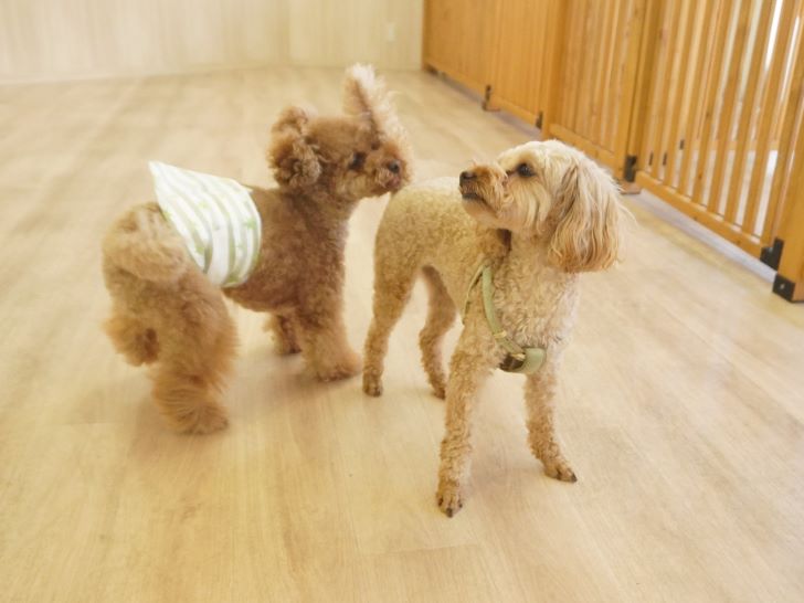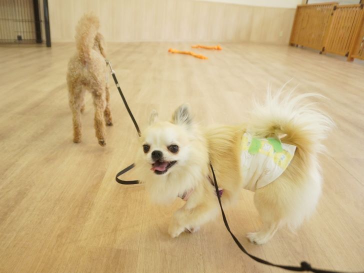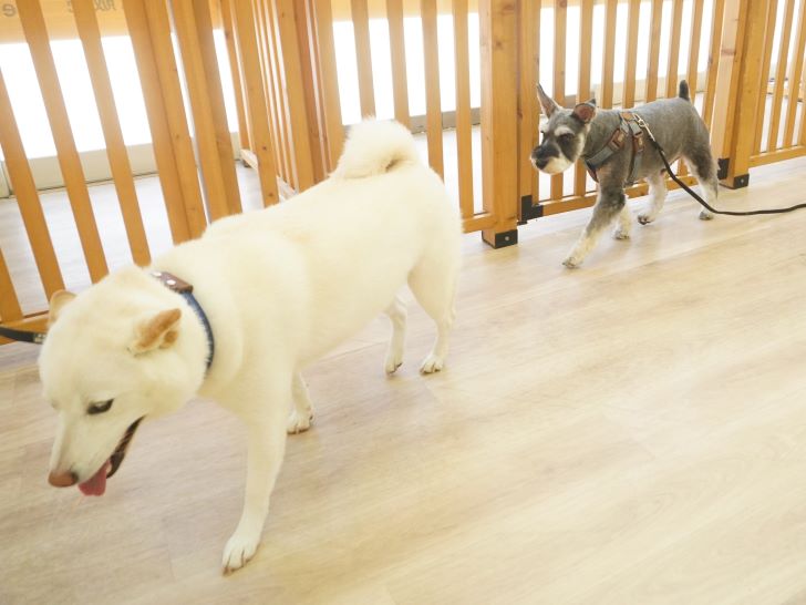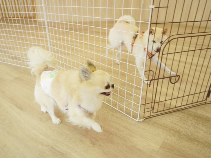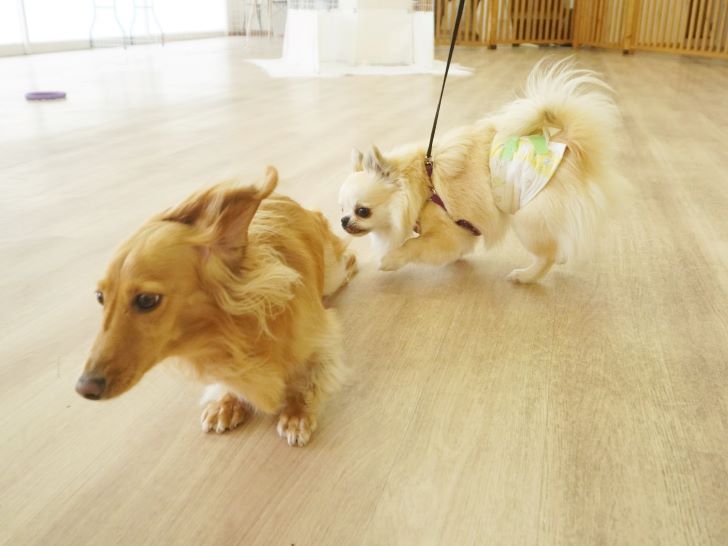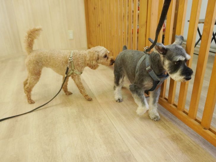 りき君がフリースペースにやって来ると、「ちょっと嗅いじゃおうかな~」とそっとオチリを追いかけていました🍑