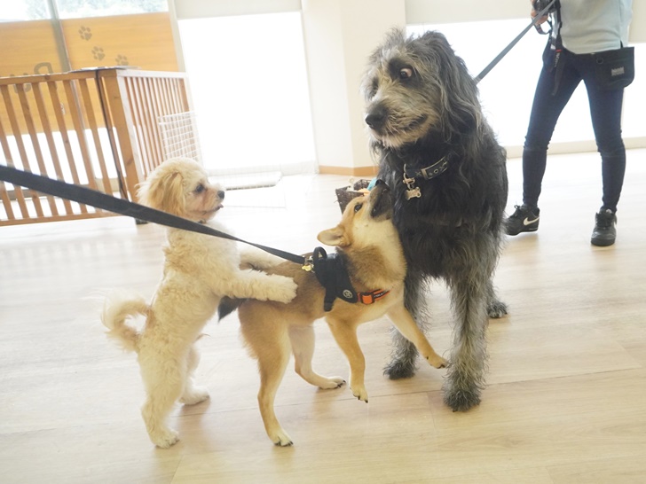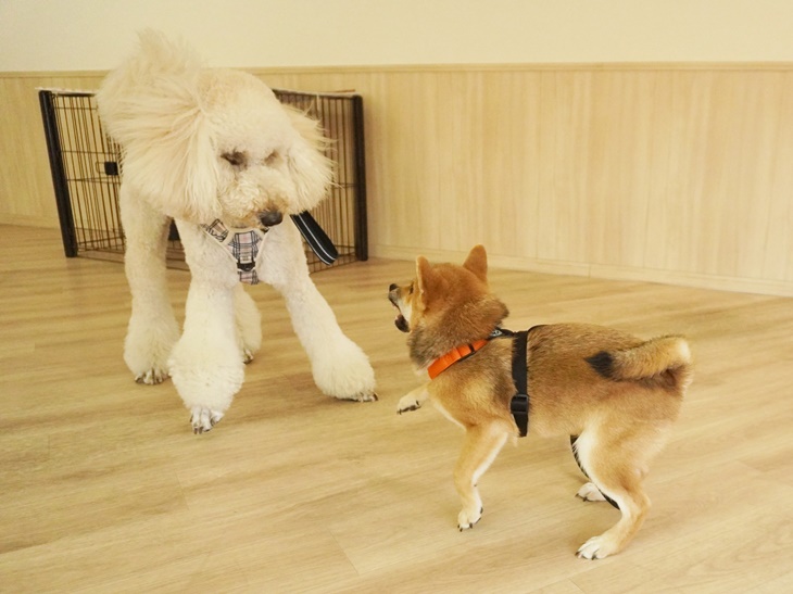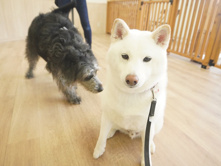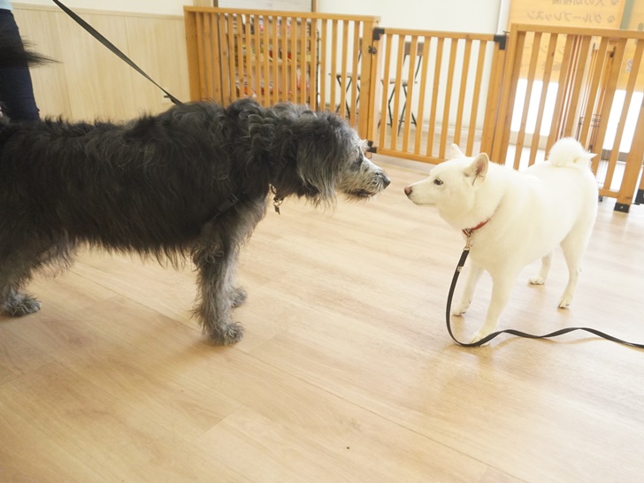 距離を取りながらもお互い様子をうかがっていましたが、途中ハル君に座って待っていてもらい、ルピ君からにおいチェックをさせてもらって、少しずつ距離を縮めてご挨拶することができました☆