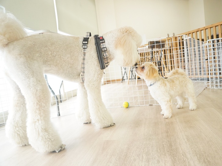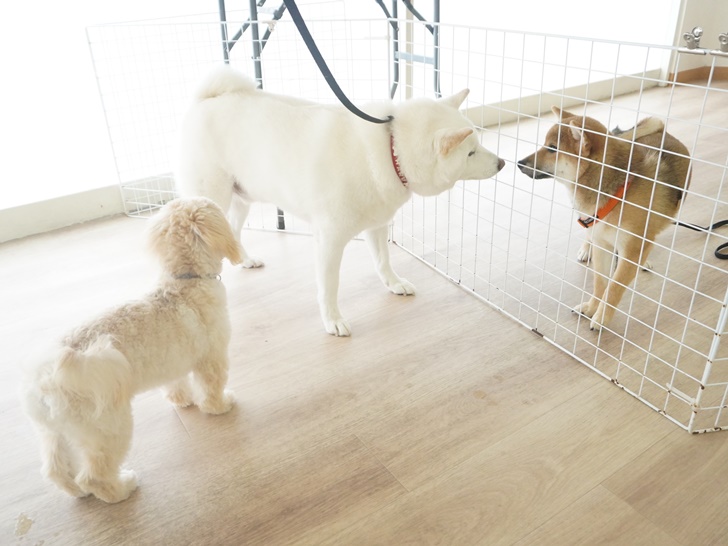 お互い「誰かしら?」と気にはしつつも、吠えたり過剰に反応したりすることもなく、穏やかに過ごしていました(*´▽`*)