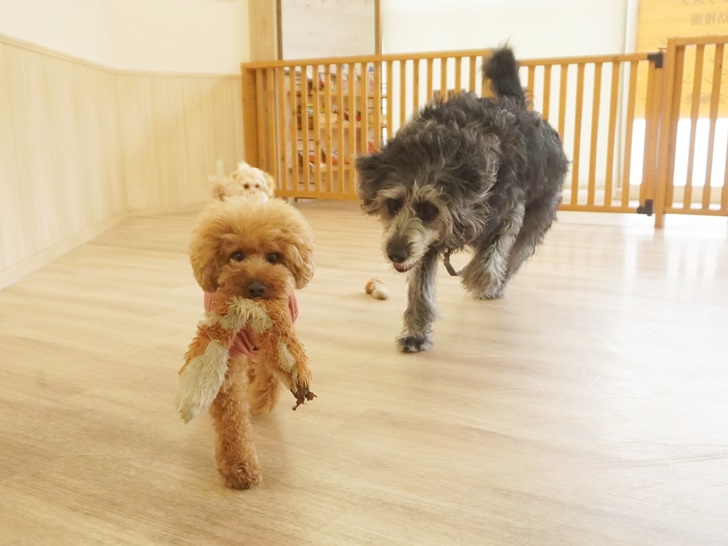 ルピ君は「わ、分かったよ~💦」とタジタジしながらも、ぎょうざちゃんのお誘いに「それじゃ、行くよー!!」と乗ってきて、おもちゃを咥えて走り出していました(≧∇≦)