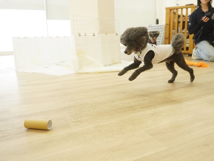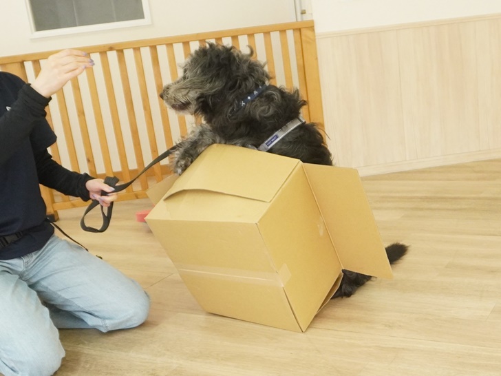 やっと四つ足入る事が出来たので、そのままスタッフが”オスワリ”というと「よっこいしょ」と座ってくれましたが、段ボールと一緒に「あ~れ~」と倒れてしまうお茶目なルピ君でした(*ノωノ)キャワー