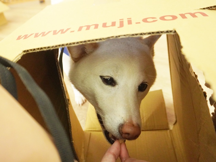 ルピ君にはちょっぴり小さい段ボールだったので、「えっこれでいいんですかっ??」と何度も前足を入れては戸惑っていました( *´艸`)