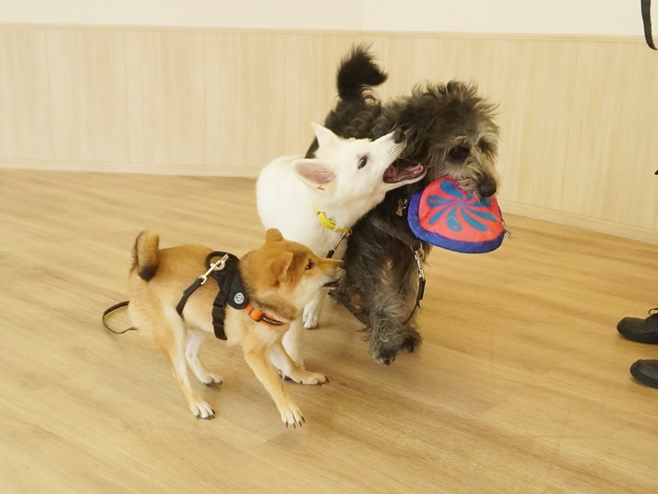 ぎょうざちゃんがフリースペースに合流すると、ルピ君とネージュちゃんに両側から「遊ぼうよー♪」と全力でアピールされていましたヾ(≧▽≦)ノ