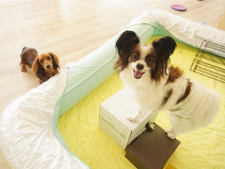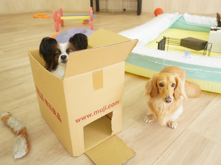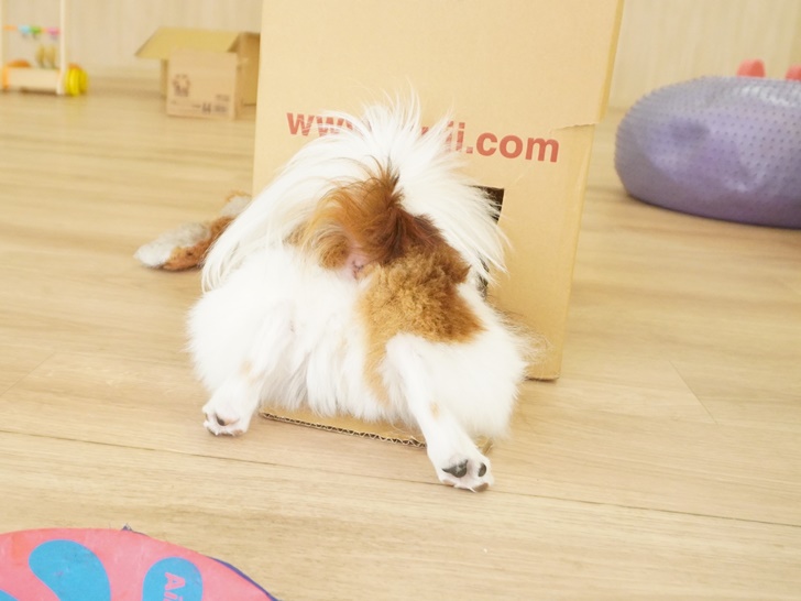 段ボールの中のオヤツをGETするために、開けられた穴から頑張って中に入ったぱん君は、「できたよ☆」と中でオスワリまでしてみせてくれました👏♪