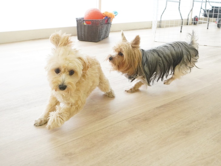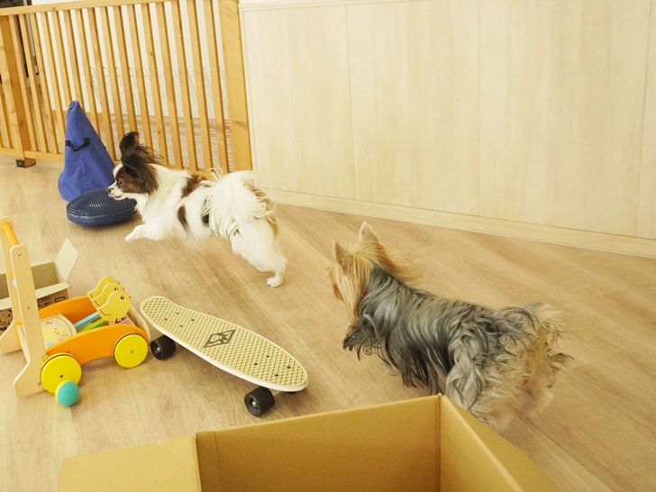 おもちゃで遊んでいたトワちゃんも、思わずおもちゃを咥えたままで「待て待てー♫」と全力でクッキー君を追いかけて楽しんでいましたよ😆