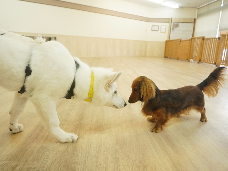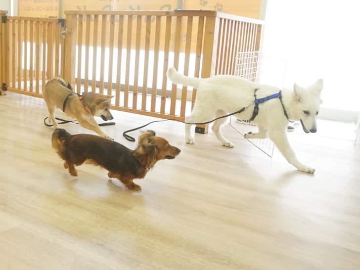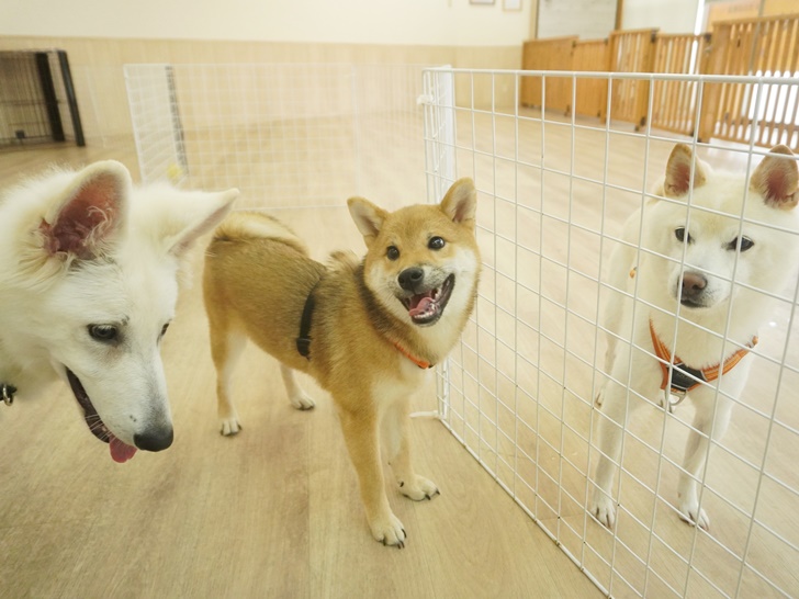 スタッフ犬のまめ君とは、サークル越しで会ったチロ君とネージュちゃんでした(*´▽`*)