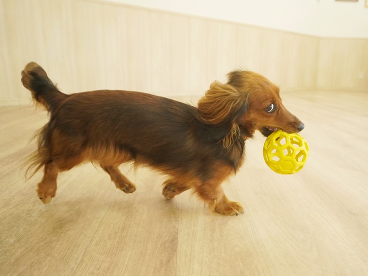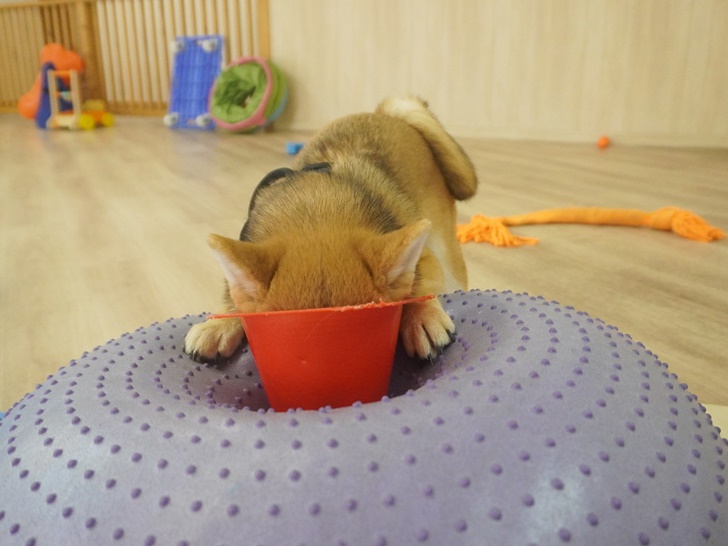 チロ君は物怖じする事無く、オヤツをGETすべくバランスボールのコーンに顔をスッポリはめていました(*^-^*)