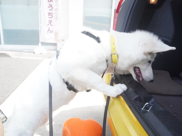 最初のうちは「車は嫌ぁ~」と離れようとするネージュちゃんでしたが、じっくり時間をかけると「頑張ってみるっ」と前足を車に乗せる事ができちゃいました(●´ω`●)
