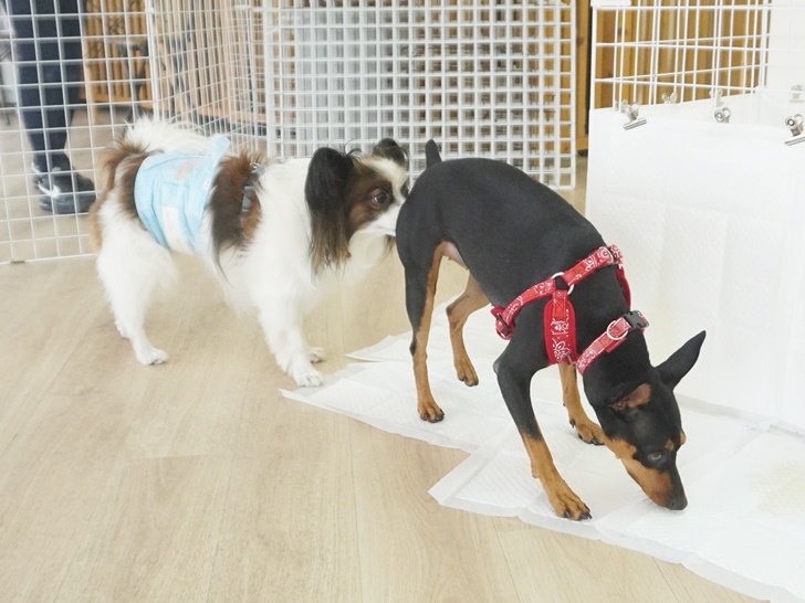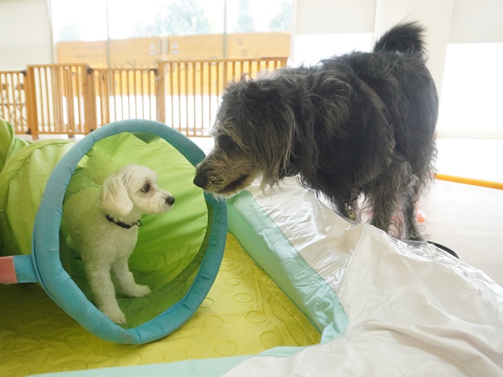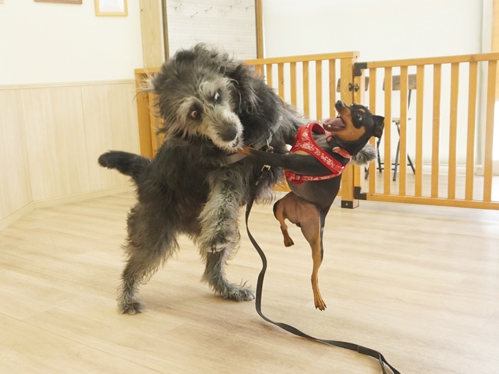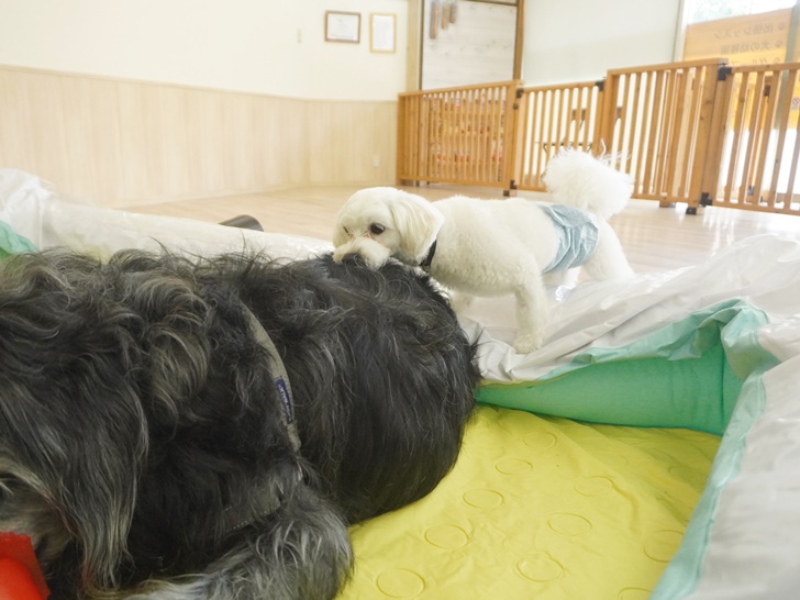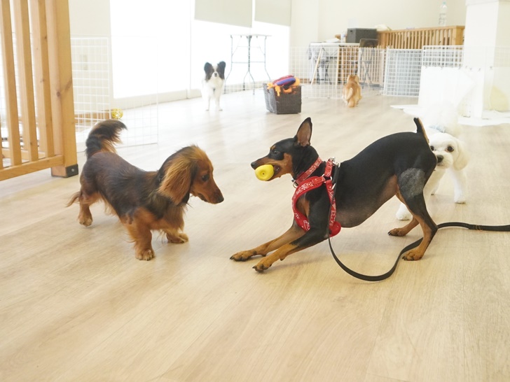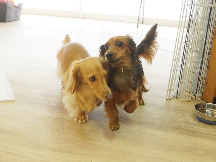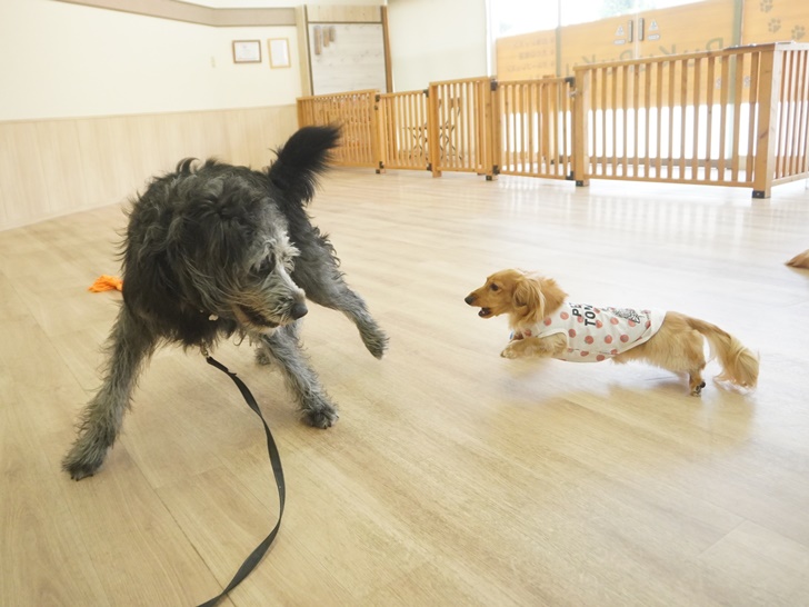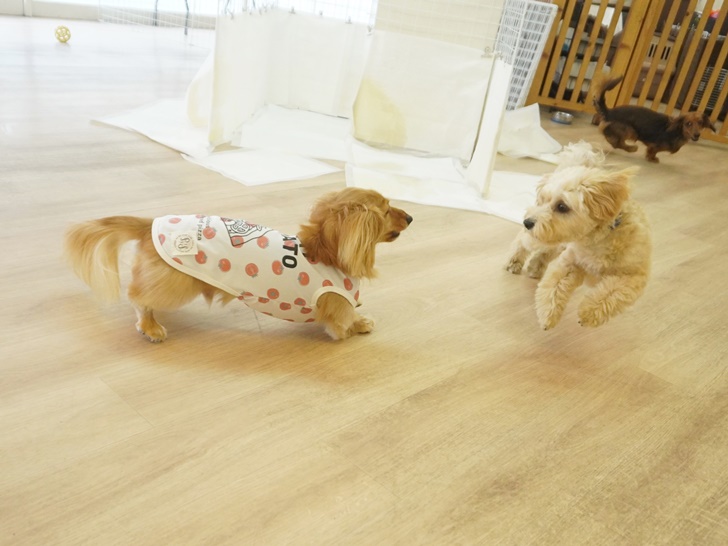 ノア君はフリースペースにいるトワちゃんを見つけると、「あっ、トワちゃんだ♪」と尻尾フリフリ!ルンルンで近づいていくと、さっそく体をぶつけて「遊ぼー♪」とお誘いしていました((((oノ´3`)ノ♡