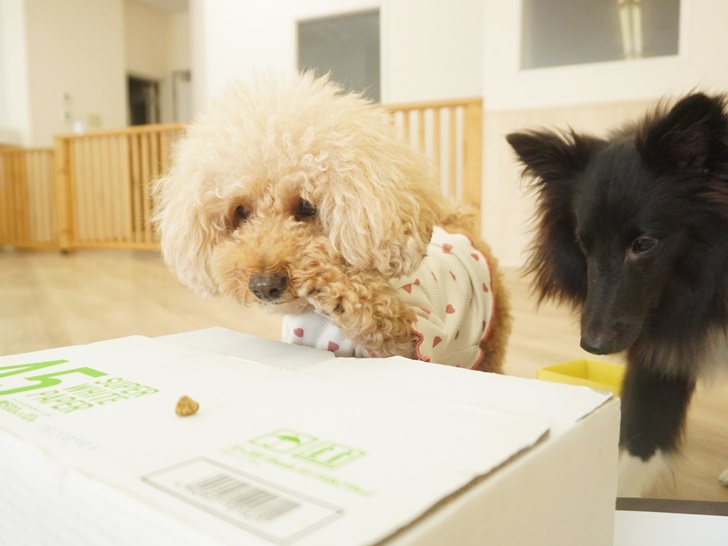 段ボールの上にあるオヤツをGETする時には、あーでもないこーでもない!と前足で「あとちょっとー!」と手繰り寄せてGETする事ができていたのでした✨