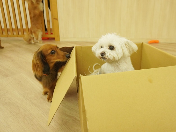 お久しぶりの登園だったマル君は、お宝探しの時間にすっぽり段ボールに入っていました(#^.^#)