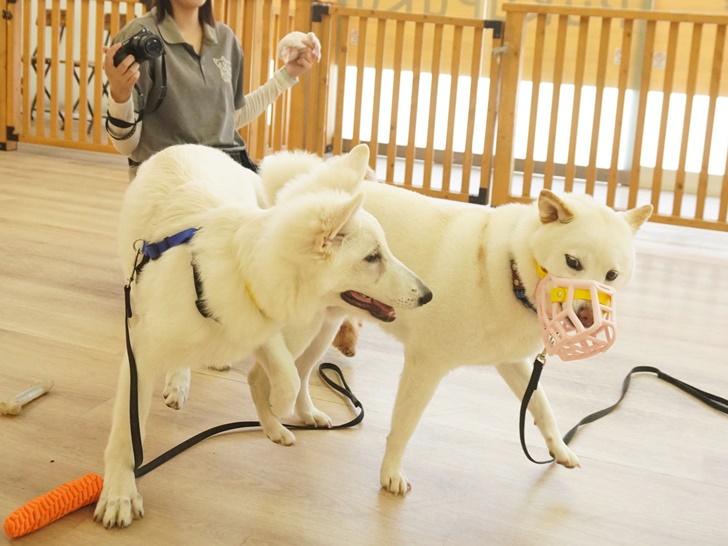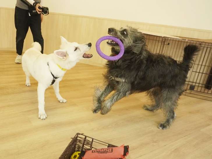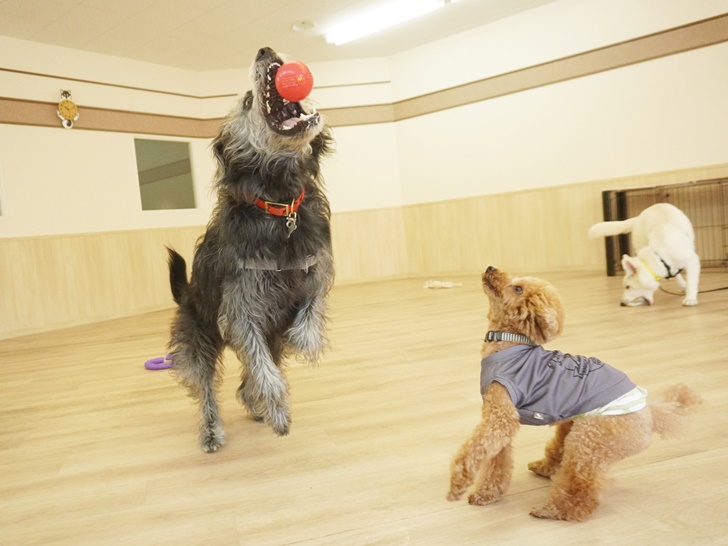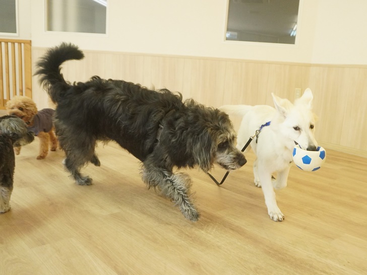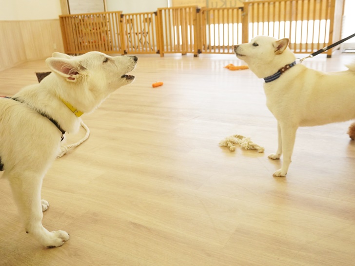 「一緒に遊んでよー」とお喋り攻撃してくるネージュちゃんに、はじめのうちは「なんだよ~」と遠吠えでお返事をしていましたが、次第にエンジンがかかっていました(∩´∀`)∩